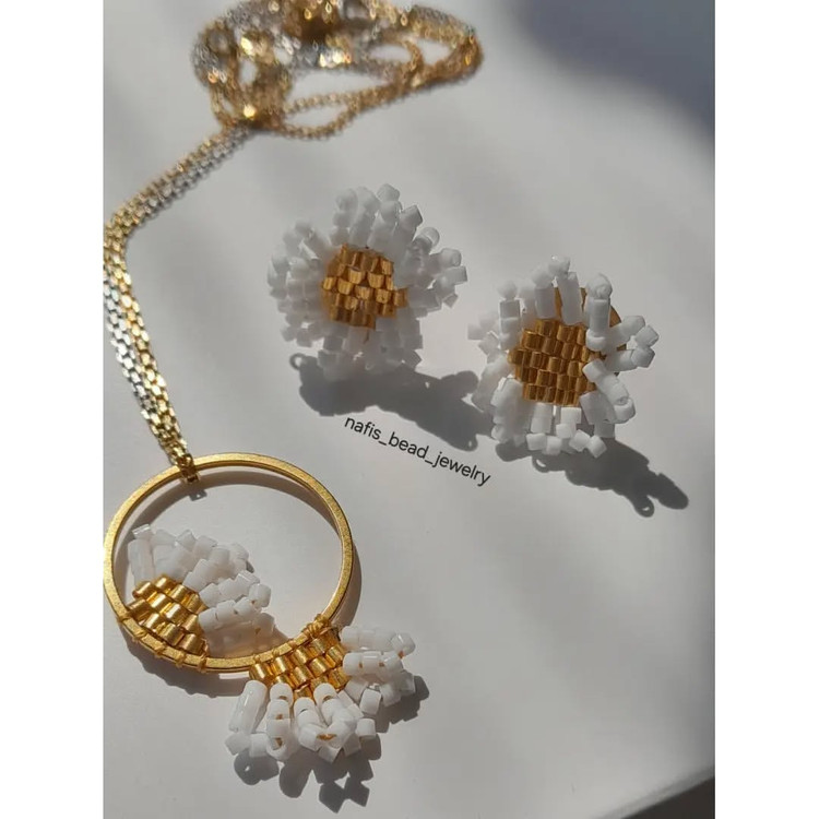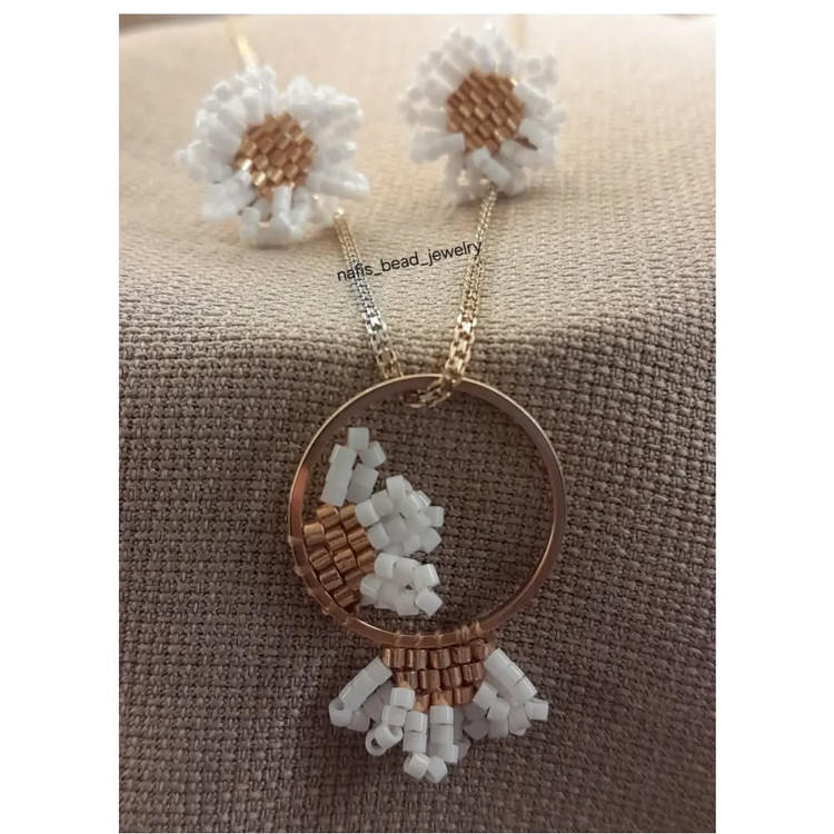 نیم ست بهاری بافته شده با مونجوقهای با کیفیت میوکی شامل گوشواره و آویز گردن بدون زنجیر. اتصالات استیل رنگ ثابت هستند.
