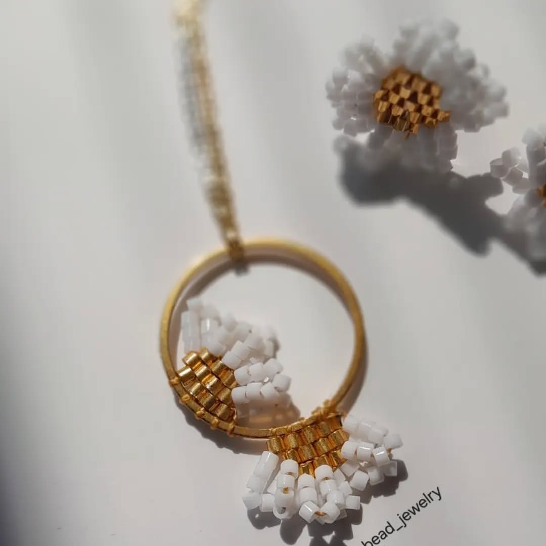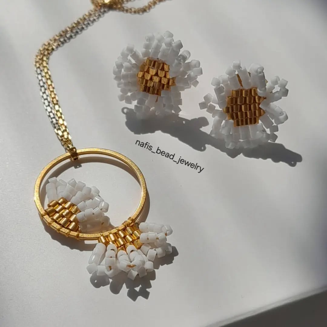 نیم ست بهاری بافته شده با مونجوقهای با کیفیت میوکی شامل گوشواره و آویز گردن بدون زنجیر. اتصالات استیل رنگ ثابت هستند.