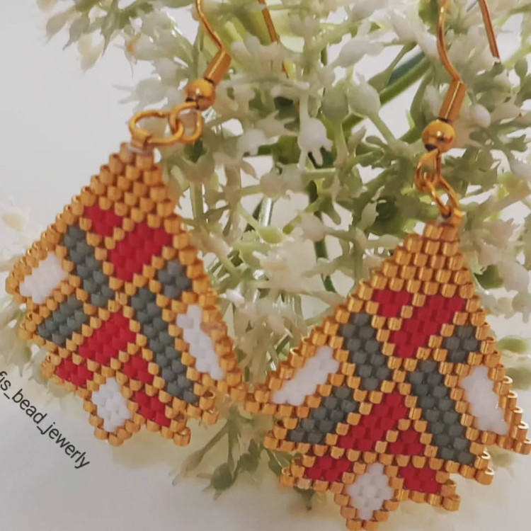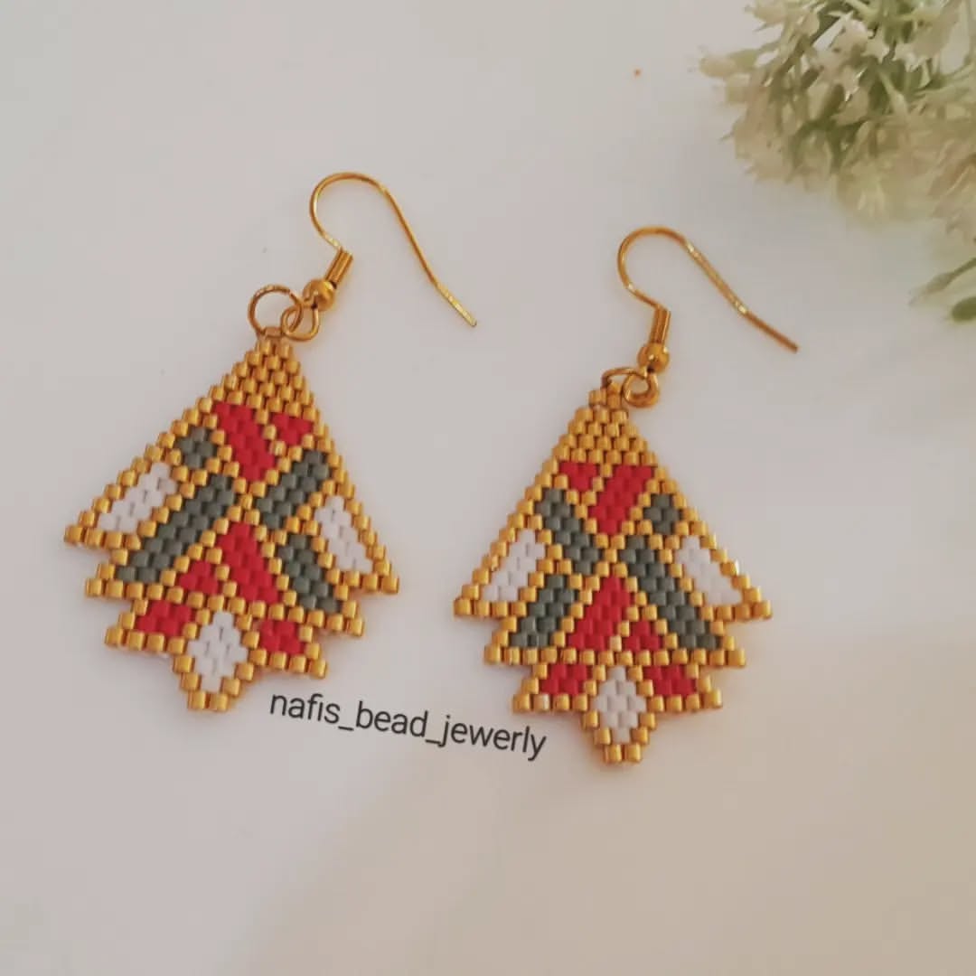 گوشوارههای طرح مدرن بافته شده با بافت پیکسل و با مونجوقهای خاص و با کیفیت میوکی ژاپن و با آبکاری طلا. اتصالاتش استیل رنگ ثابته.