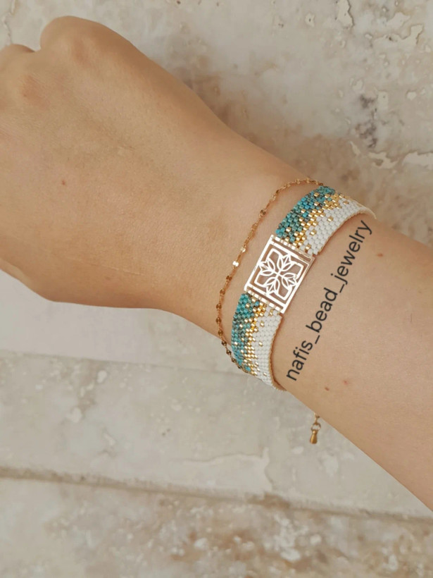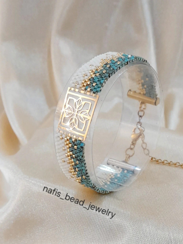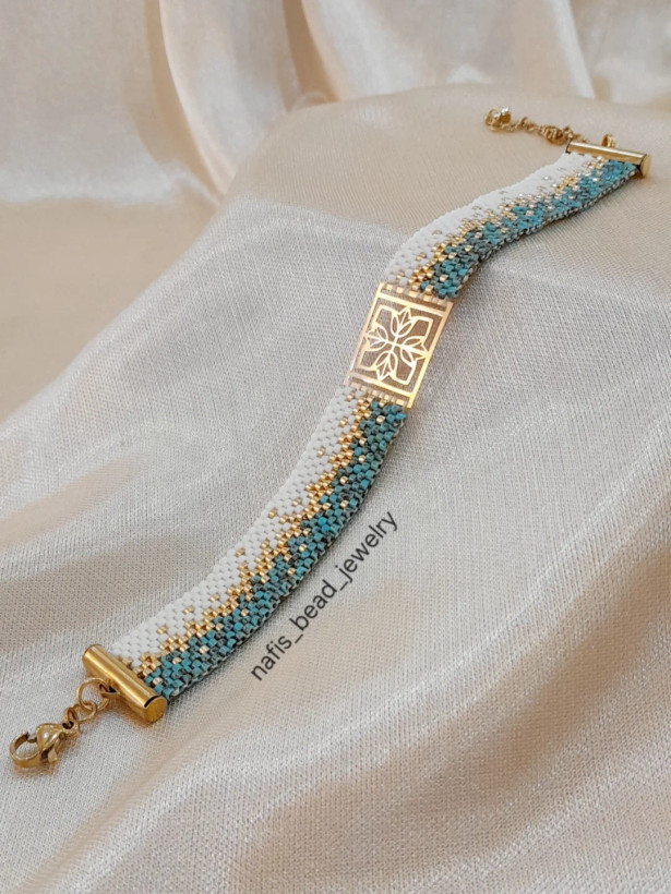 دستبند با ترکیب رنگ کرم،طلایی،فیروزهای که بسیار مشابه سنگهای فیروزه رگهدار هستن! بافته شده با مونجوقهای خاص و با کیفیت میوکی ژاپن و مونجوقهای طلایی آبکاری طلا.