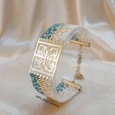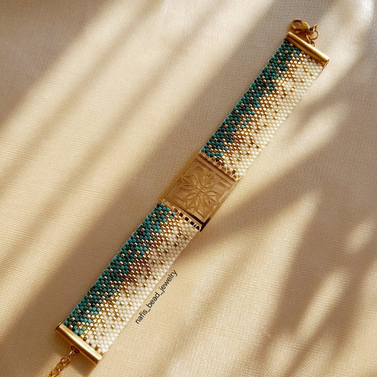 دستبند سفارشی پلاک طلا! با ترکیب رنگ کرم، طلایی، فیروزهای طرح پیکاسو که بسیار مشابه سنگهای فیروزه رگهدار هستن! بافته شده با مونجوقهای خاص و با کیفیت میوکی ژاپن و مونجوقهای طلایی آبکاری طلا! خرجکار استیل رنگ ثابت! با بند کشویی و نخ دستبندی هم قابل طول ۱۴ سانت برای مچ معمولی برای مچ پرتر تا ۱۶ سانت قابل اجرا با کمی افزایش.