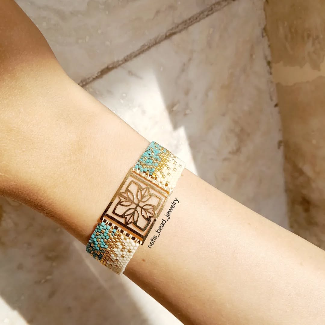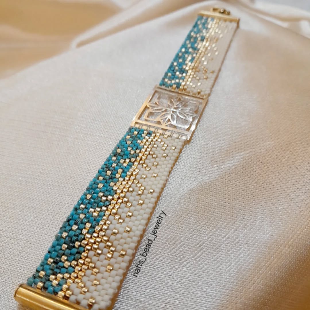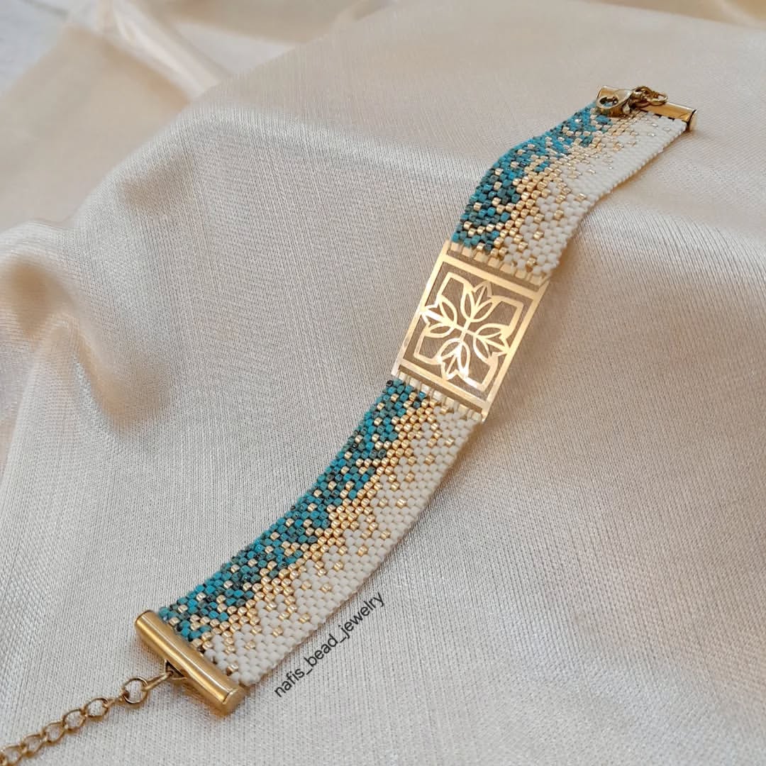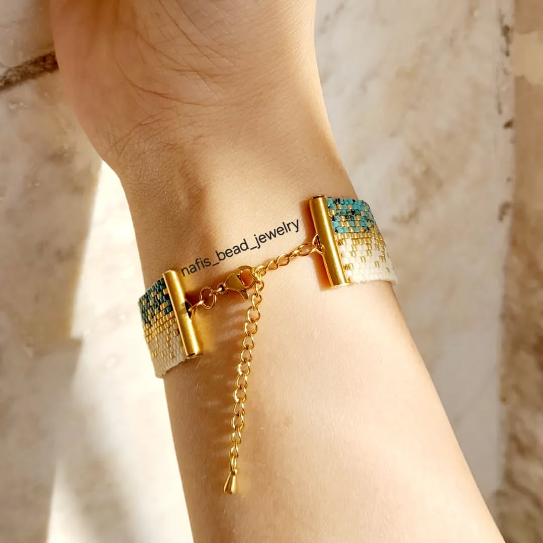 دستبند سفارشی پلاک طلا! با ترکیب رنگ کرم، طلایی، فیروزهای طرح پیکاسو که بسیار مشابه سنگهای فیروزه رگهدار هستن! بافته شده با مونجوقهای خاص و با کیفیت میوکی ژاپن و مونجوقهای طلایی آبکاری طلا! خرجکار استیل رنگ ثابت! با بند کشویی و نخ دستبندی هم قابل طول ۱۴ سانت برای مچ معمولی برای مچ پرتر تا ۱۶ سانت قابل اجرا با کمی افزایش.