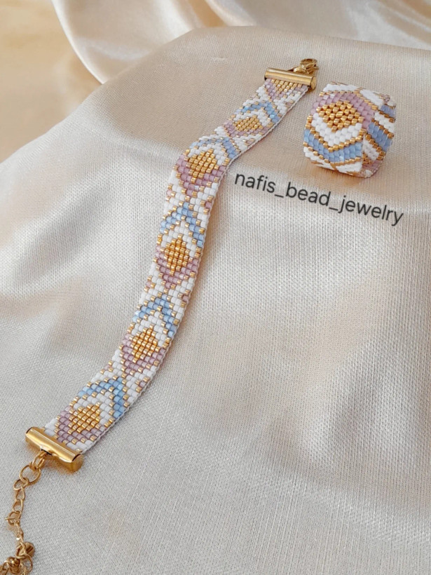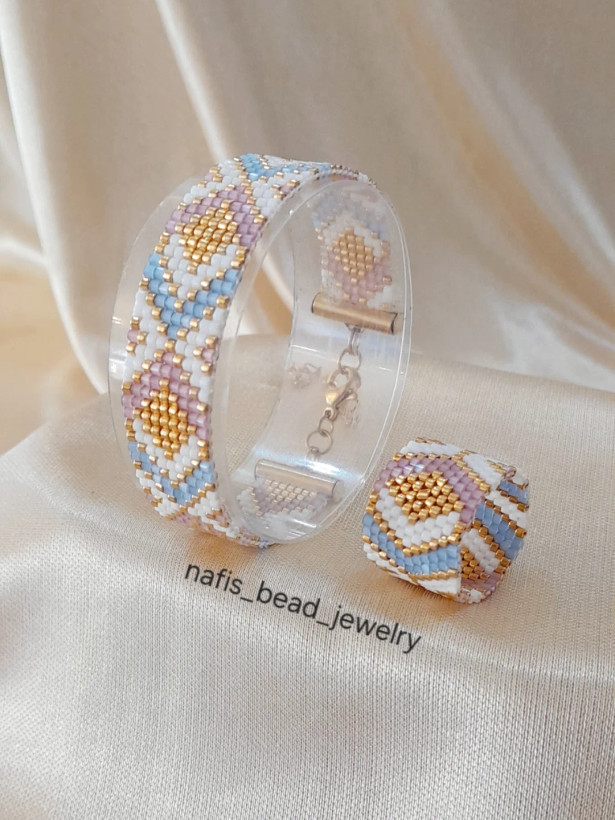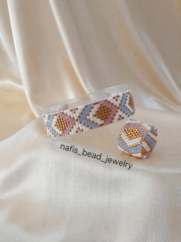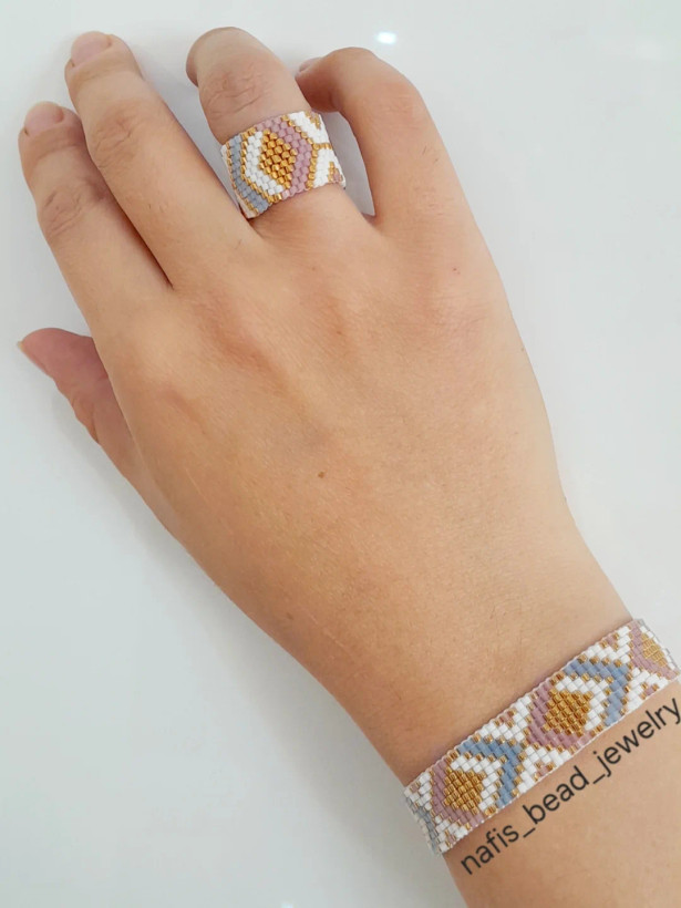 نیم ست انگشتر و دستبند بافته شده با مونجوقهای میوکی ژاپن