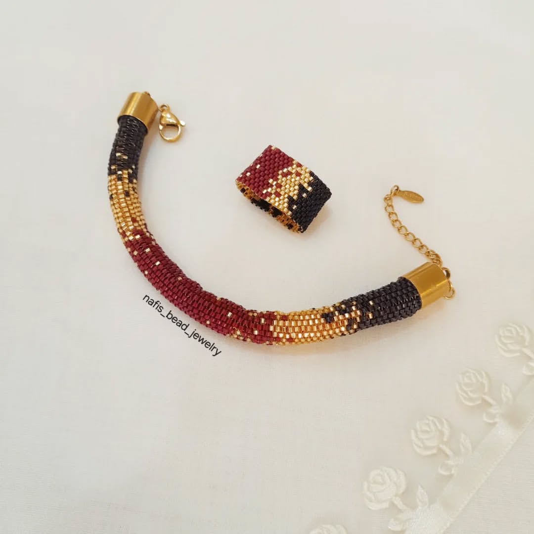دستبند با مونجوق طلایی آبکاری طلا و قطر ۱۰ میل و انگشتر با مونجوق طلایی آبکاری طلا. بافته شده با مونجوقهای خاص و با کیفیت میوکی ژاپن.