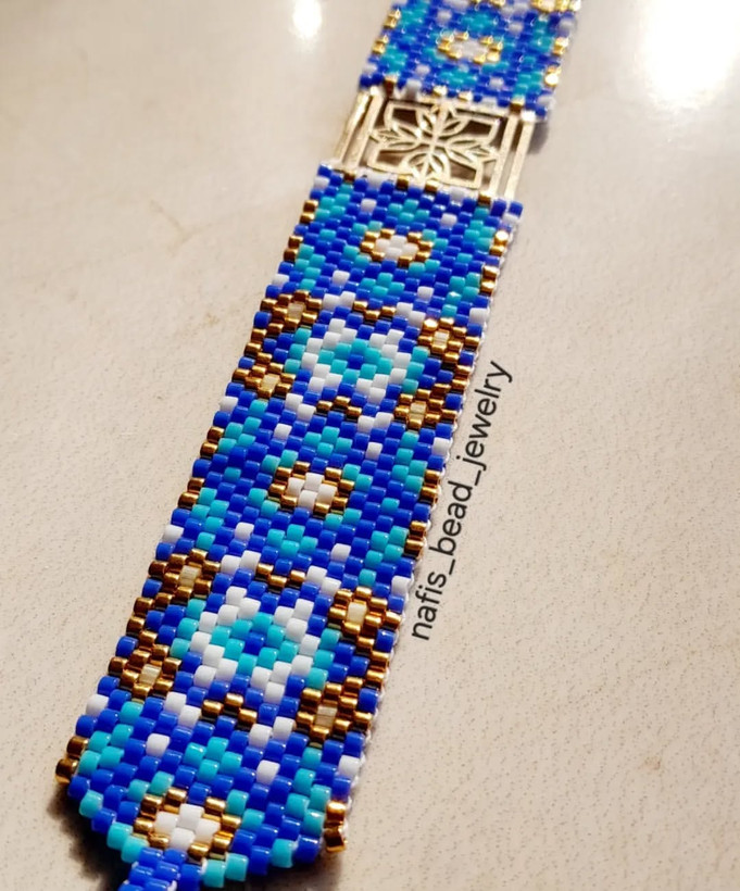 دستبند با ترکیب رنگ لاجوردی و فیروزه ای، بافته شده با مونجوقهای خاص و با کیفیت میوکی ژاپن و مونجوقهای طلایی آبکاری طلا. طول ۱۴ سانت برای مچ معمولی و قابل اجرا برای مچ پرتر تا ۱۶ سانت.