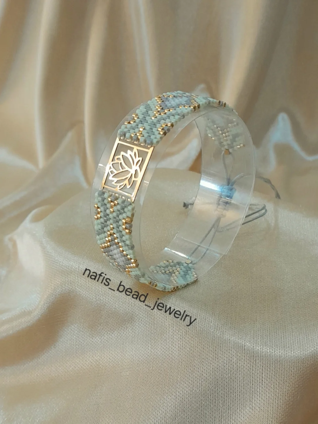 پلاک طلا لوتوس با بند ترکیب رنگ سبز پاستلی و طوسی