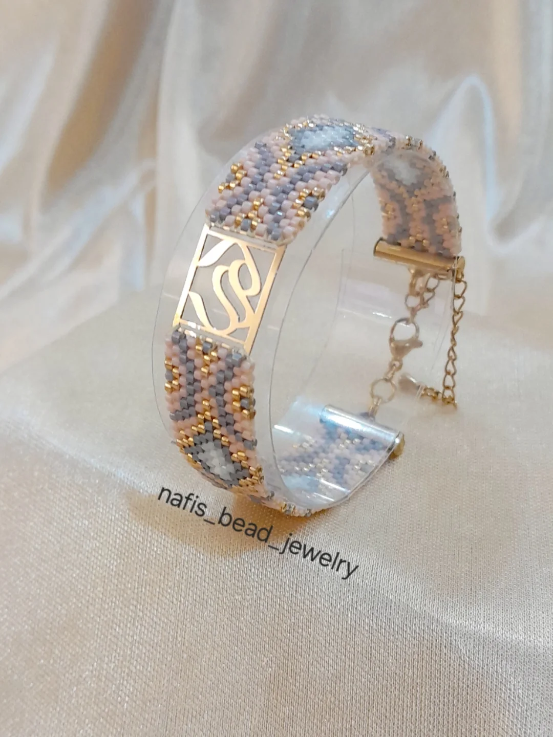 دستبند سفارشی پلاک طلا با مونجوقهای میوکی ژاپن