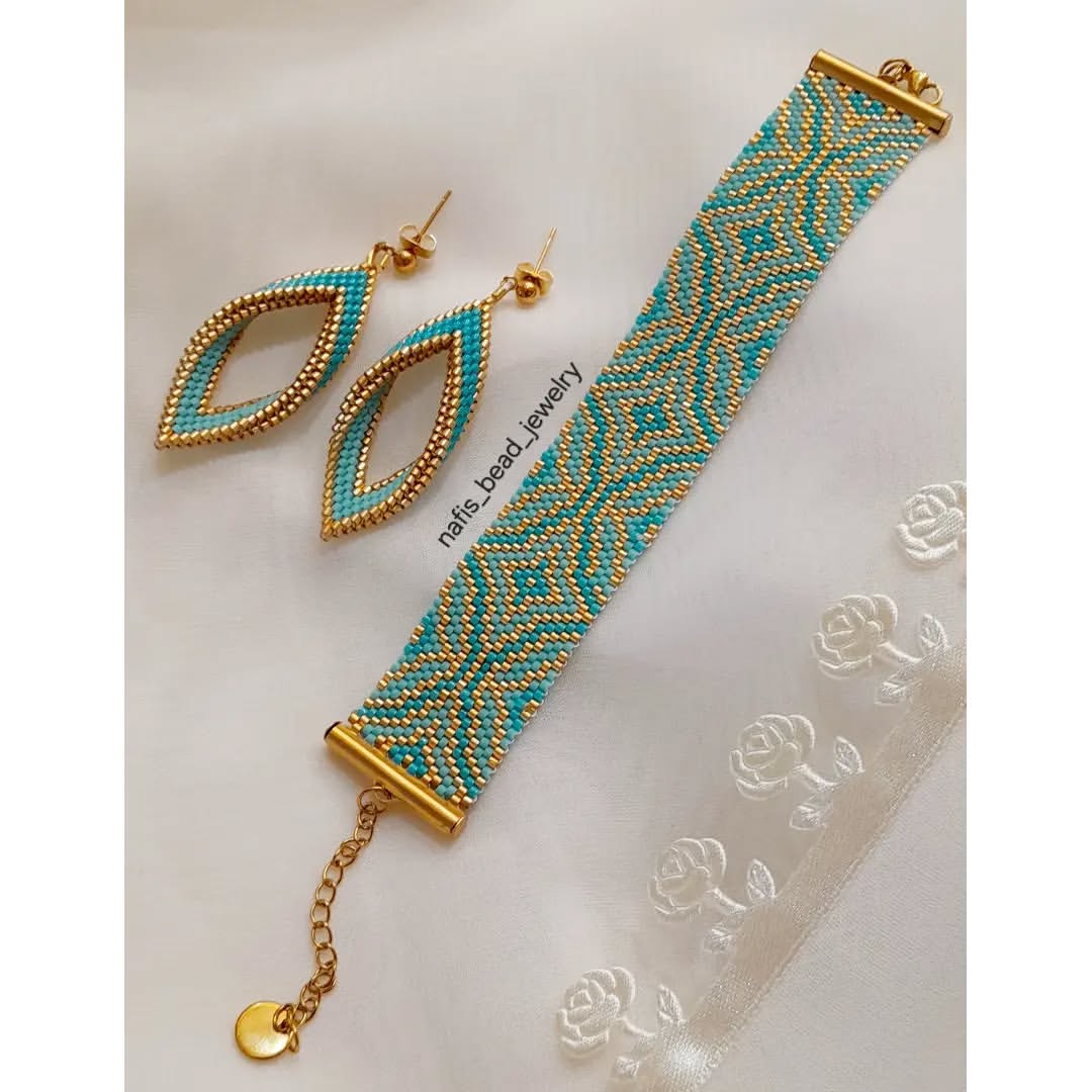 نیم ست فیروزه‌ای بافت پیکسل با آبکاری طلا